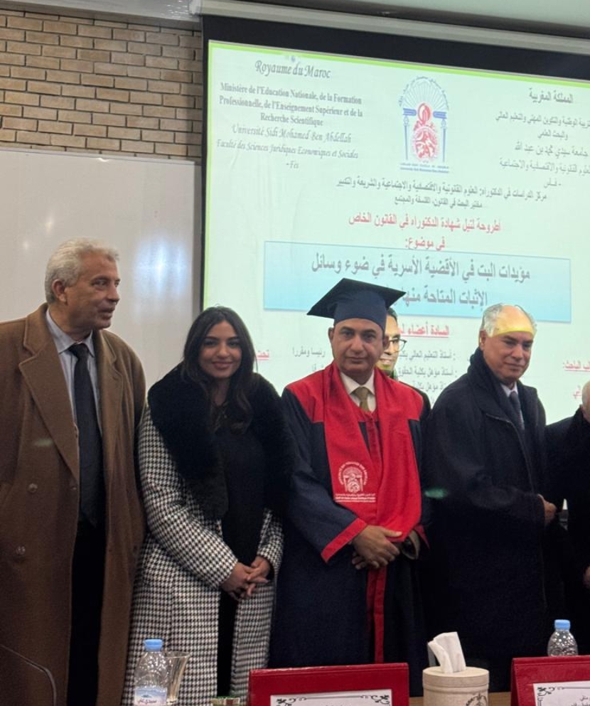بكل فخر واعتزاز، وبمناسبة نيل شهادة الدكتوراه في القانون الخاص، تحت عنوان ” مؤيدات البت في الأقضية الأسرية على ضوء وسائل الإثبات المتاحة منها والممكنة“،تحت إشراف د.كريم متقي، أستاذ محاضر مؤهل بكلية الحقوق بفاس، و د.عبد القادر قرموش، أستاذ التعليم العالي بكلية الحقوق بفاس، رئيسا ومقررا.