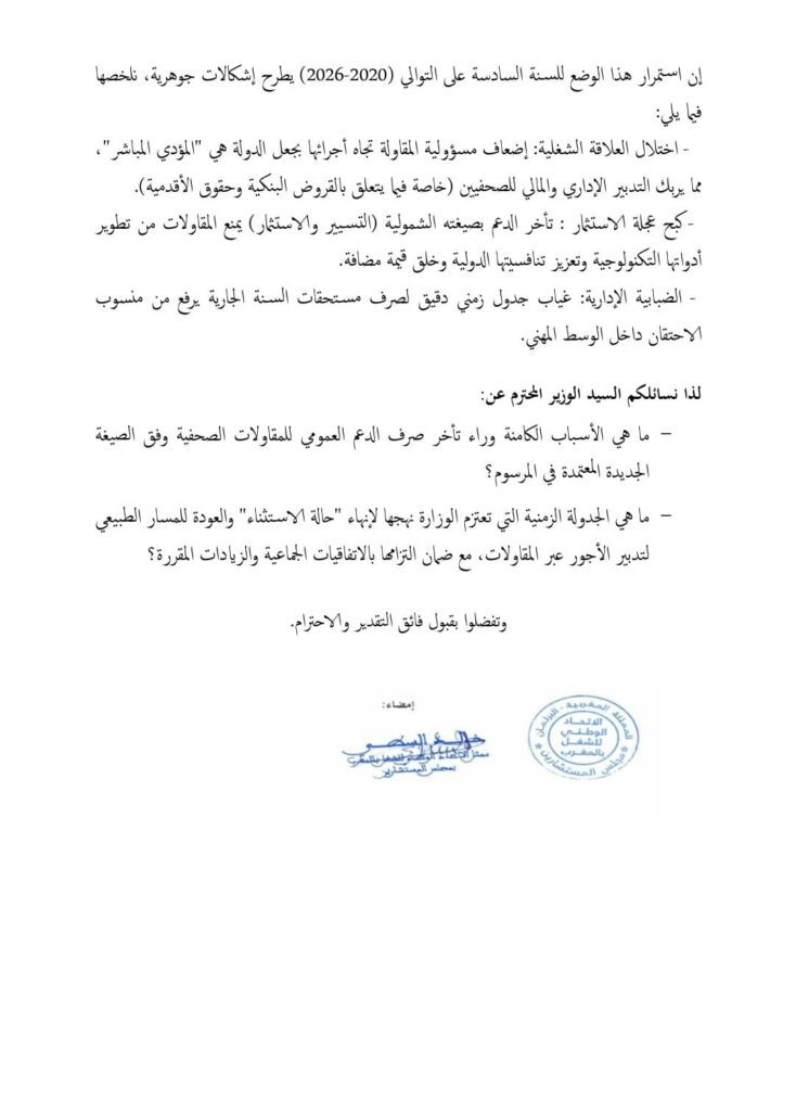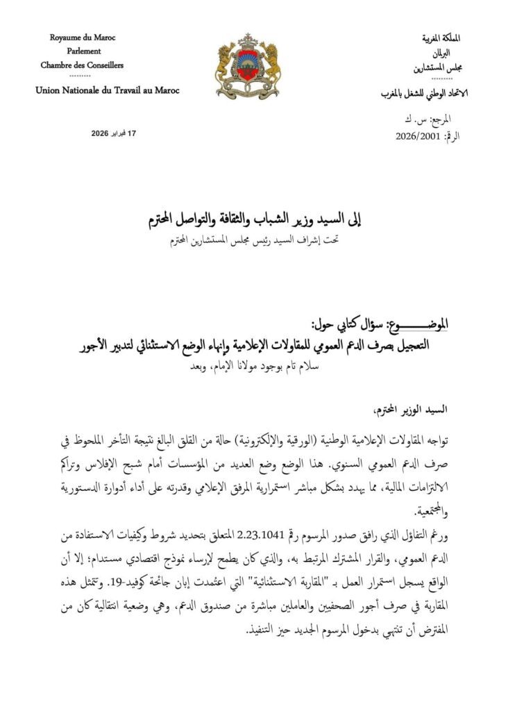 وفي مراسلة موجهة إلى وزارة الشباب والثقافة والتواصل، للمسنشار البرلماني خالد تلسطي، وتحت إشراف مجلس المستشارين، جرى التنبيه إلى التداعيات المتزايدة لهذا التأخر، خاصة في ظل ارتفاع تكاليف التسيير وتراكم الالتزامات المالية، الأمر الذي يهدد بعض المؤسسات الإعلامية بشبح الإفلاس ويؤثر على استقرار العاملين فيها.
